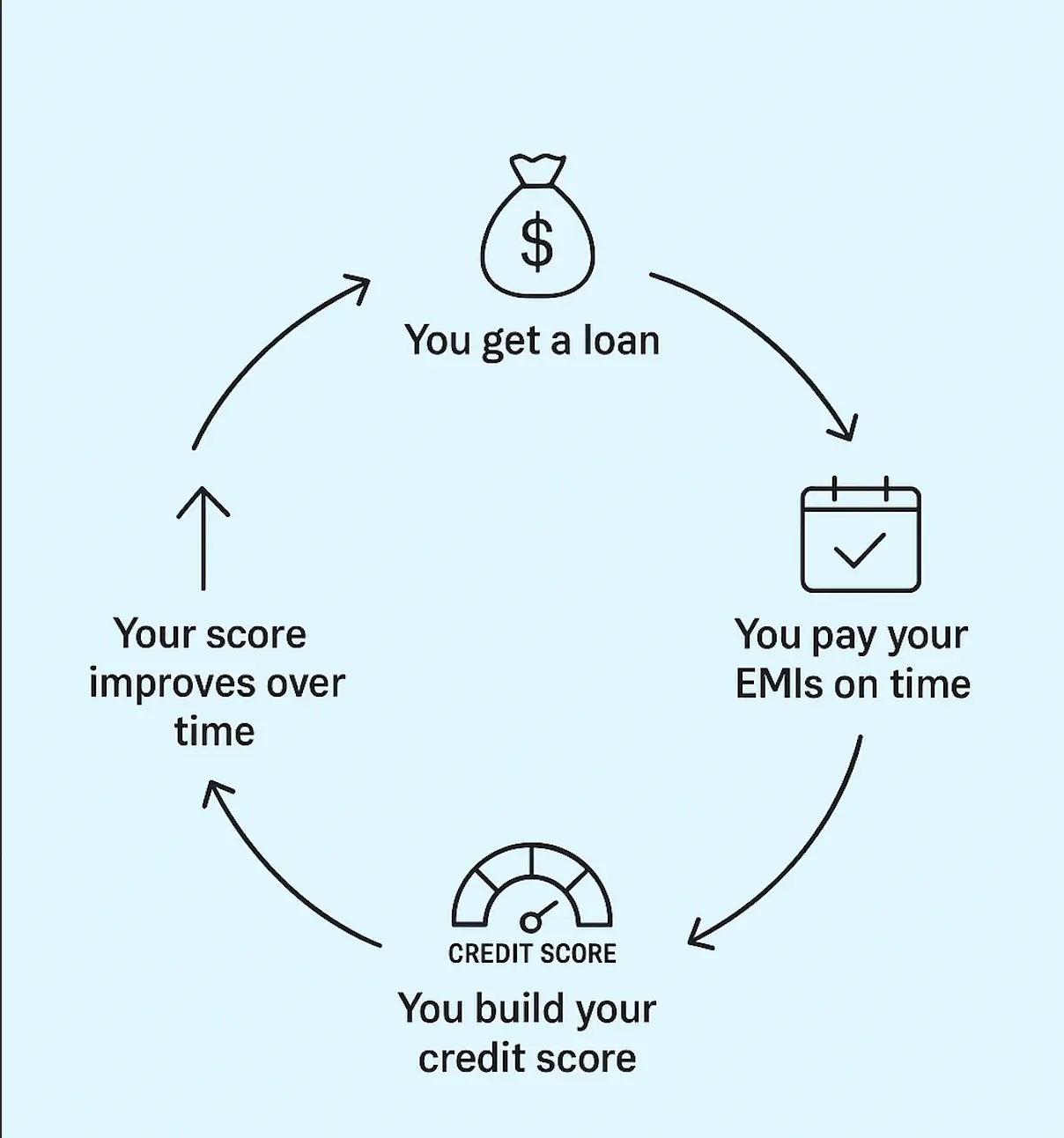 I started my credit score journey with a loan of ₹2 lakh. Back in college, I had freelancing income, so my bank offered me an instant loan option through its mobile app. I decided to try it, and within seconds, the loan was credited to my account! It was for a year, and I had to pay 10% interest, but I never missed an EMI, and my credit score improved significantly as a result.